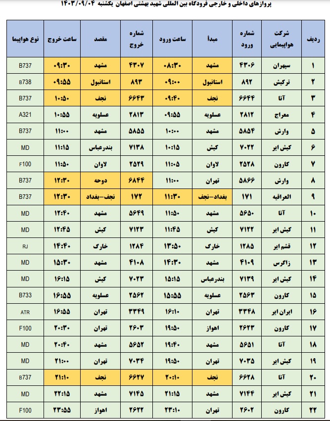 به گزارش نبض وطن، اطلاعات پروازهای داخلی و خارجی فرودگاه بینالمللی شهید بهشتی اصفهان امروز _یکشنبه چهارم آذر_ به شرح زیر است: