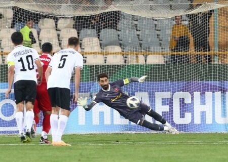 علیرضا بیرانوند دروازهبان تیم فوتبال پرسپولیس موفق شد ضربه پنالتی بازیکن استقلال تاجیکستان را مهار کند.