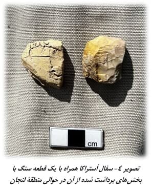 وی میافزاید: در بازدید علمی از محل که به دعوت انجمن حافظان میراث لنجان صورت گرفت، مجموعهای از شواهد باستانشناختی شامل بقایای معماری، خردهسفالهای پراکنده، سربارههای فلزی، یک قطعه ابزار سنگی و از همه مهمتر، یک قطعه سفالنوشته (اُستراکا) به خط پهلوی ساسانی مشاهده شد.